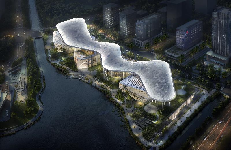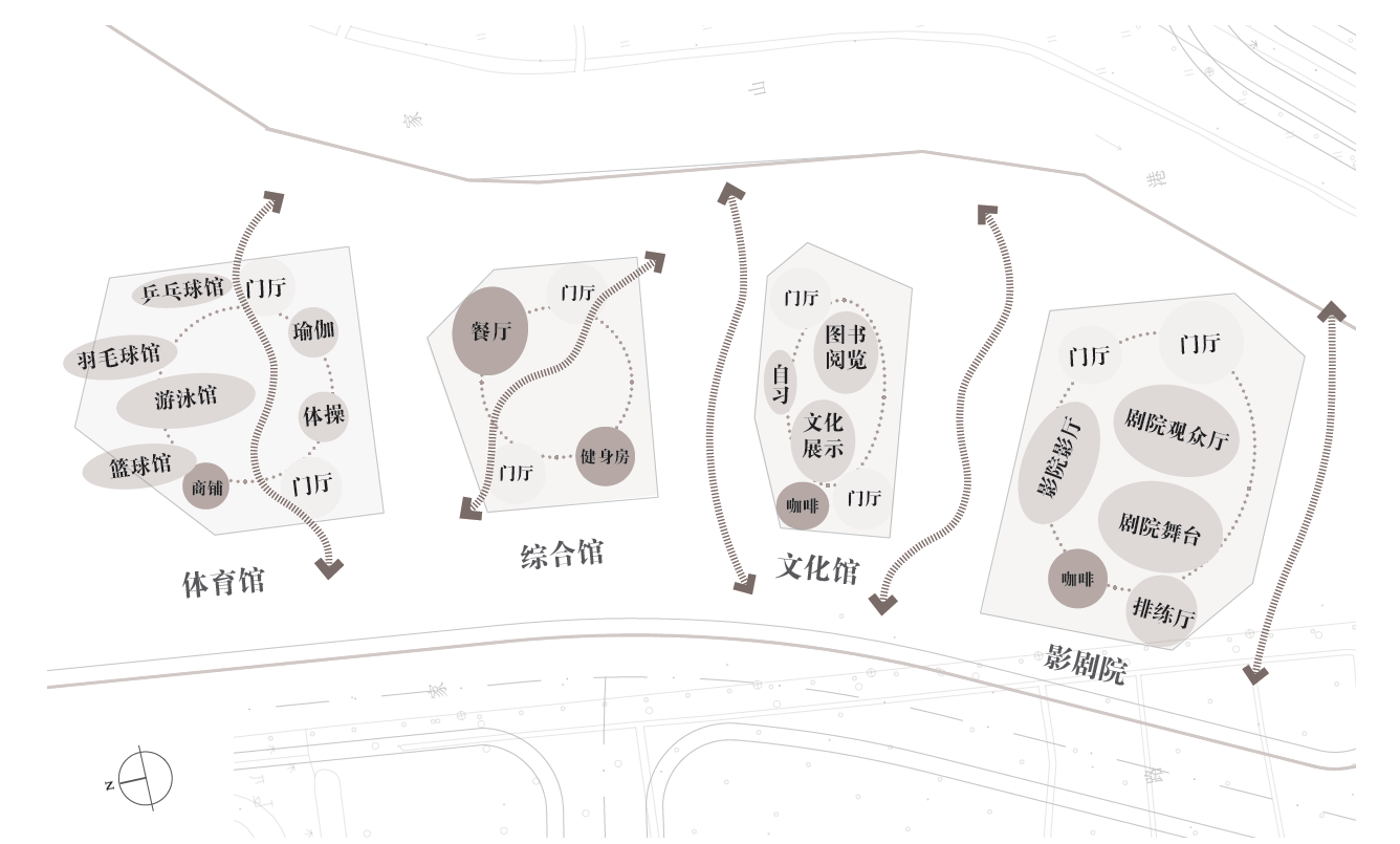 四個建筑單體自北向南分別為體育館、綜合館、文化館、影劇院,容納體育、商業、文化、演藝功能,場地上設置各類活動場地、濱水空間、多層次綠色開放空間,營建充滿活力的24小時城市客廳。