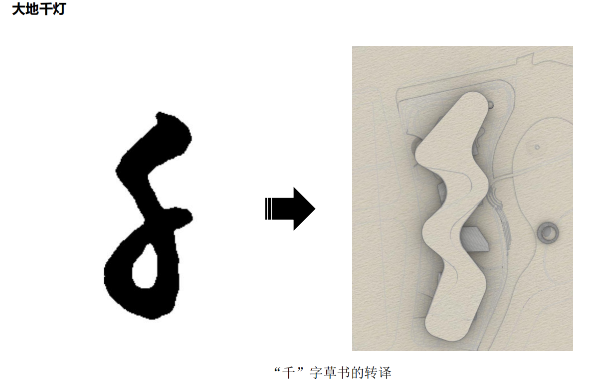 膜結構棚架的形態來源于“千燈”的“千”字草書,同時契合場地形態,從周邊辦公塔樓上、途經的飛機上可俯瞰觀賞此大地景觀,極具設計感。