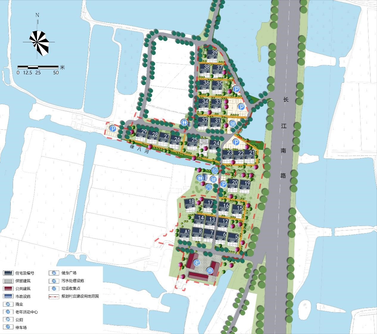 兩軸:依托長江南路、新樂路串聯各個分區,打造村莊發展軸;