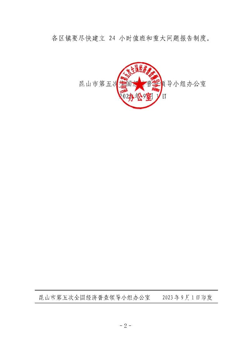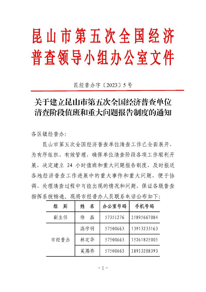 關于建立昆山市第五次全國經濟普查單位清查階段值班和重大問題報告制度的通知