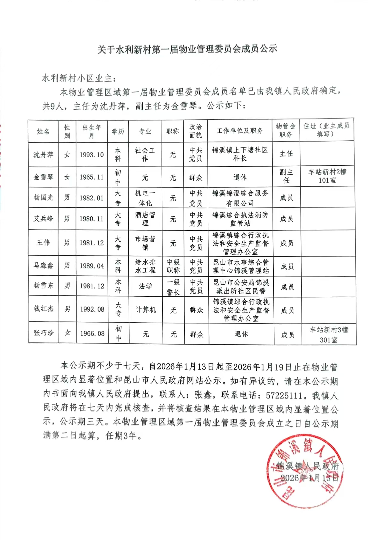 關于水利新村第一屆物業管理委員會成員公示