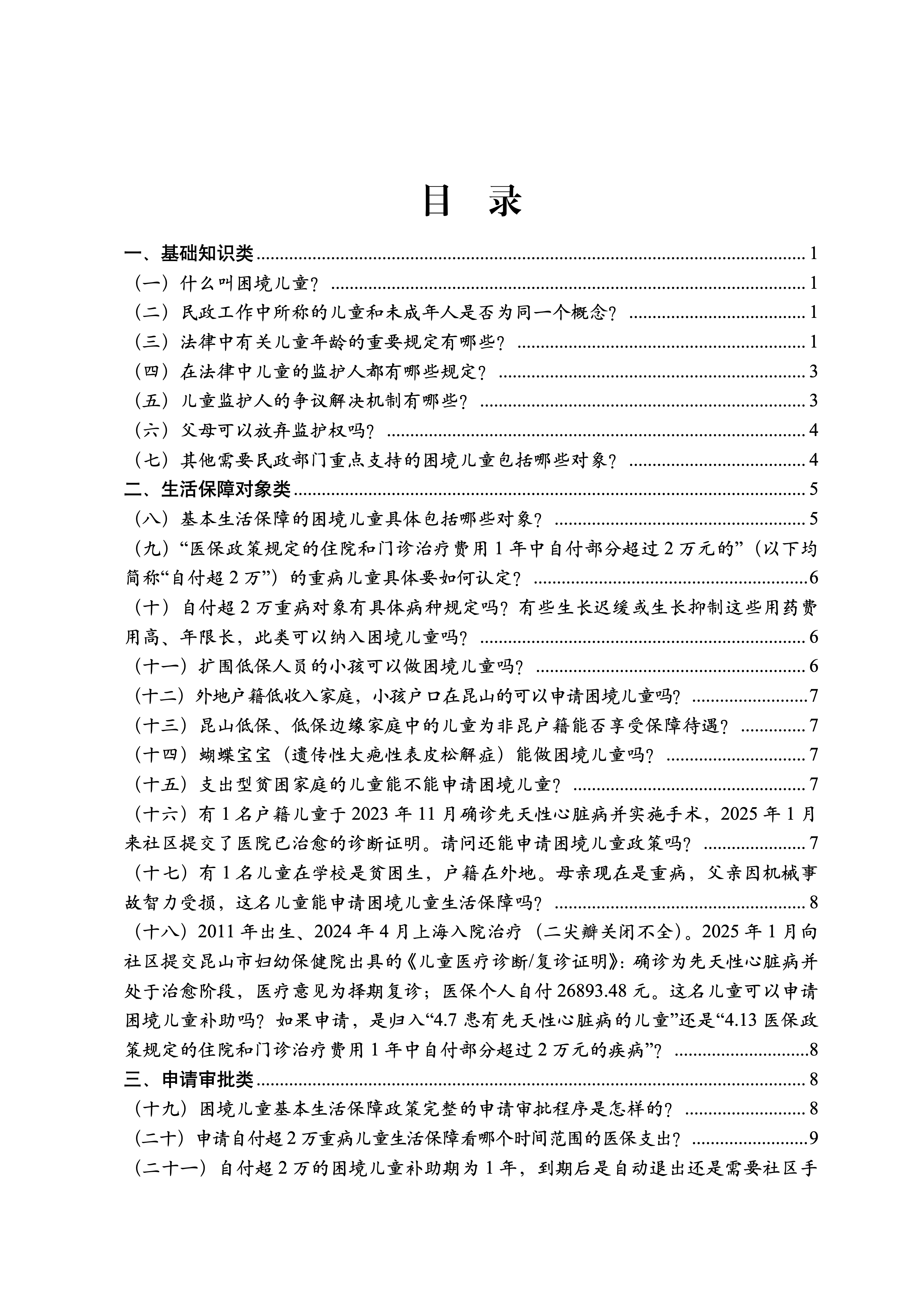基層工作千頭萬緒,現實環境下的復雜問題層出不窮,為保障兒童和殘疾人等特殊弱勢群體的基本權益,輔助基層應對各類卡點、痛點和難點問題,市民政局結合換位跑工作要求,開發“兒童與殘疾人福利政策百問百答”線上即時回應表單,在兒童主任基礎輪訓工作中捕捉基層普遍困惑,匯集重點相關部門的福利政策,研發制作《昆山市2025年兒童福利政策百問百答》《昆山市2025年殘疾人福利政策百問百答》。