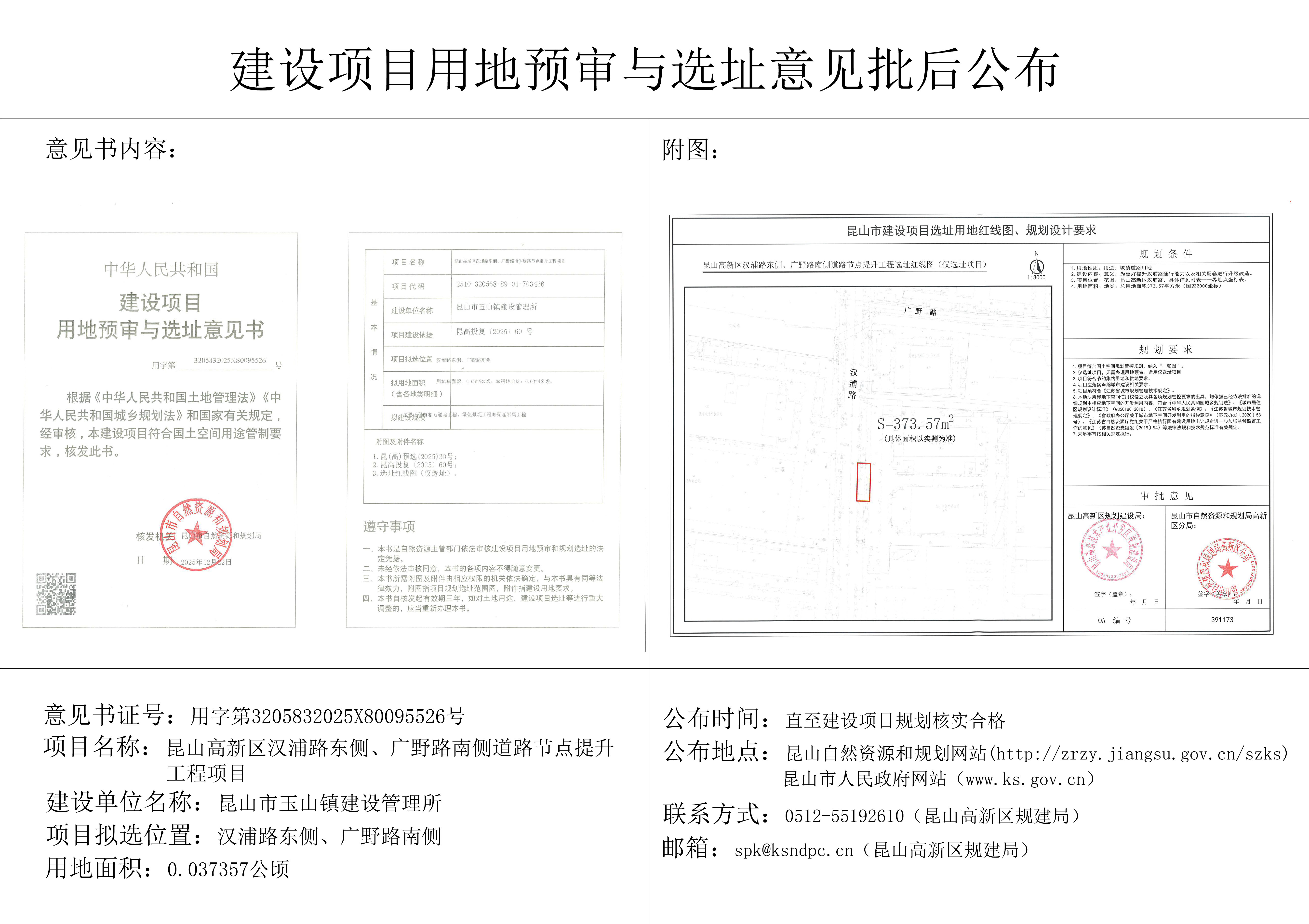昆山高新區(qū)漢浦路東側(cè)、廣野路南側(cè)道路節(jié)點(diǎn)提升工程項(xiàng)目建設(shè)項(xiàng)目用地預(yù)審與選址意見