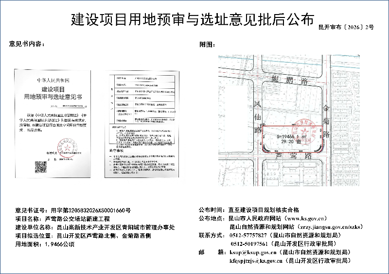 昆山高新技術產業開發區青陽城市管理辦事處蘆鶯路公交場站新建工程建設項目用地預審與選址意見批后公布