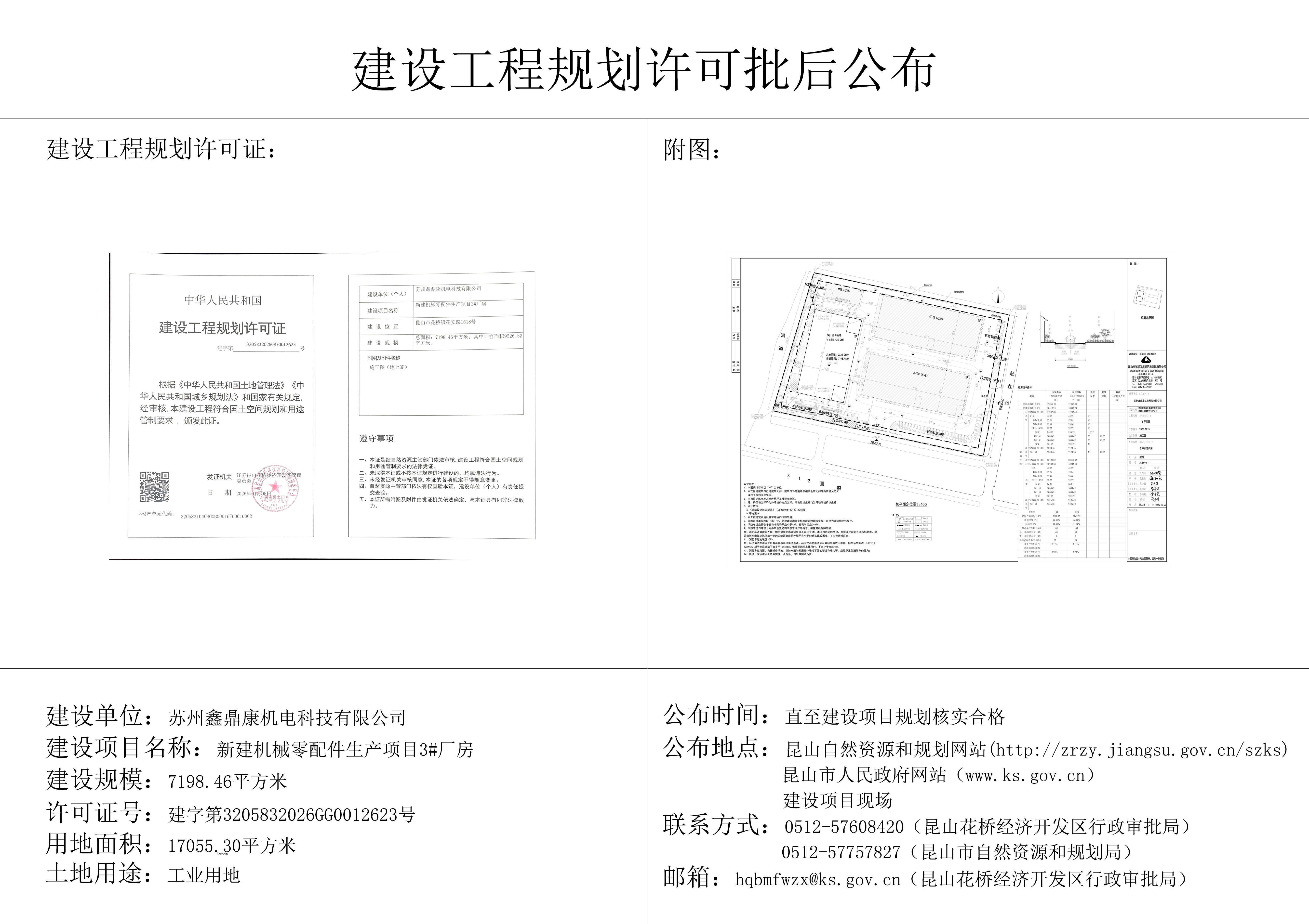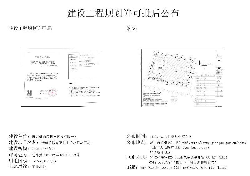 蘇州鑫鼎康機電科技有限公司3#廠房建設工程規劃許可證批后公布