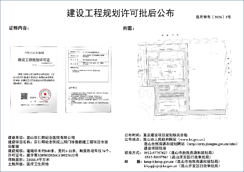 昆山宗仁卿紀念醫院有限公司宗仁卿紀念醫院二期門診樓新建工程項目市政后配套建設工程規劃許可批后公布