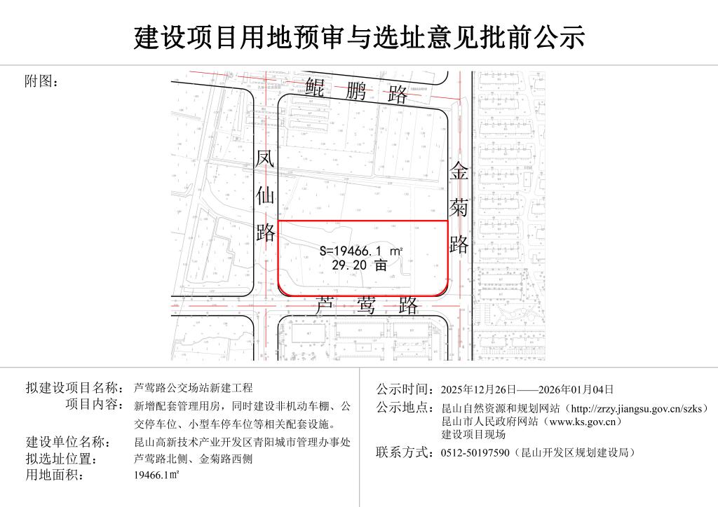 昆山開(kāi)發(fā)區(qū)規(guī)劃建設(shè)局關(guān)于蘆鶯路公交場(chǎng)站新建工程項(xiàng)目選址的批前公示