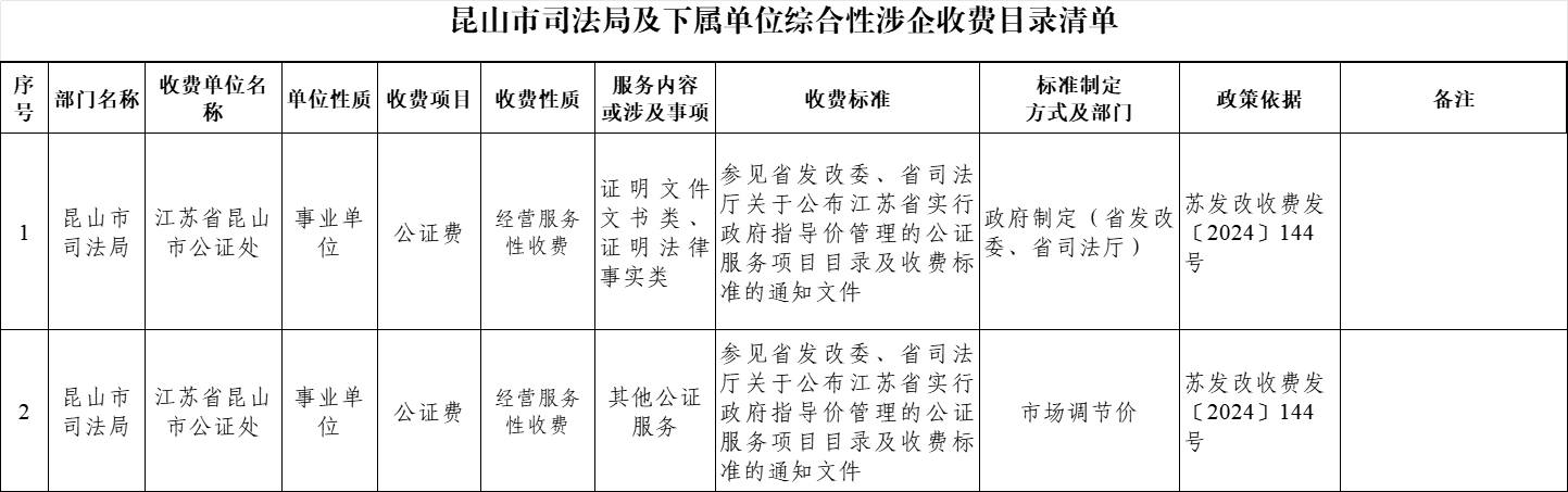 昆山市司法局及下屬單位綜合性涉企收費(fèi)目錄清單