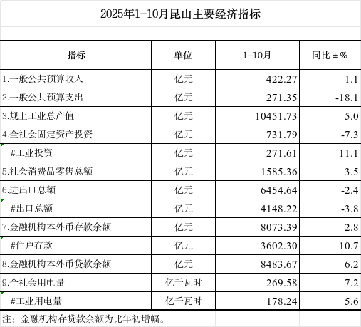 2025年1-10月昆山主要經濟指標