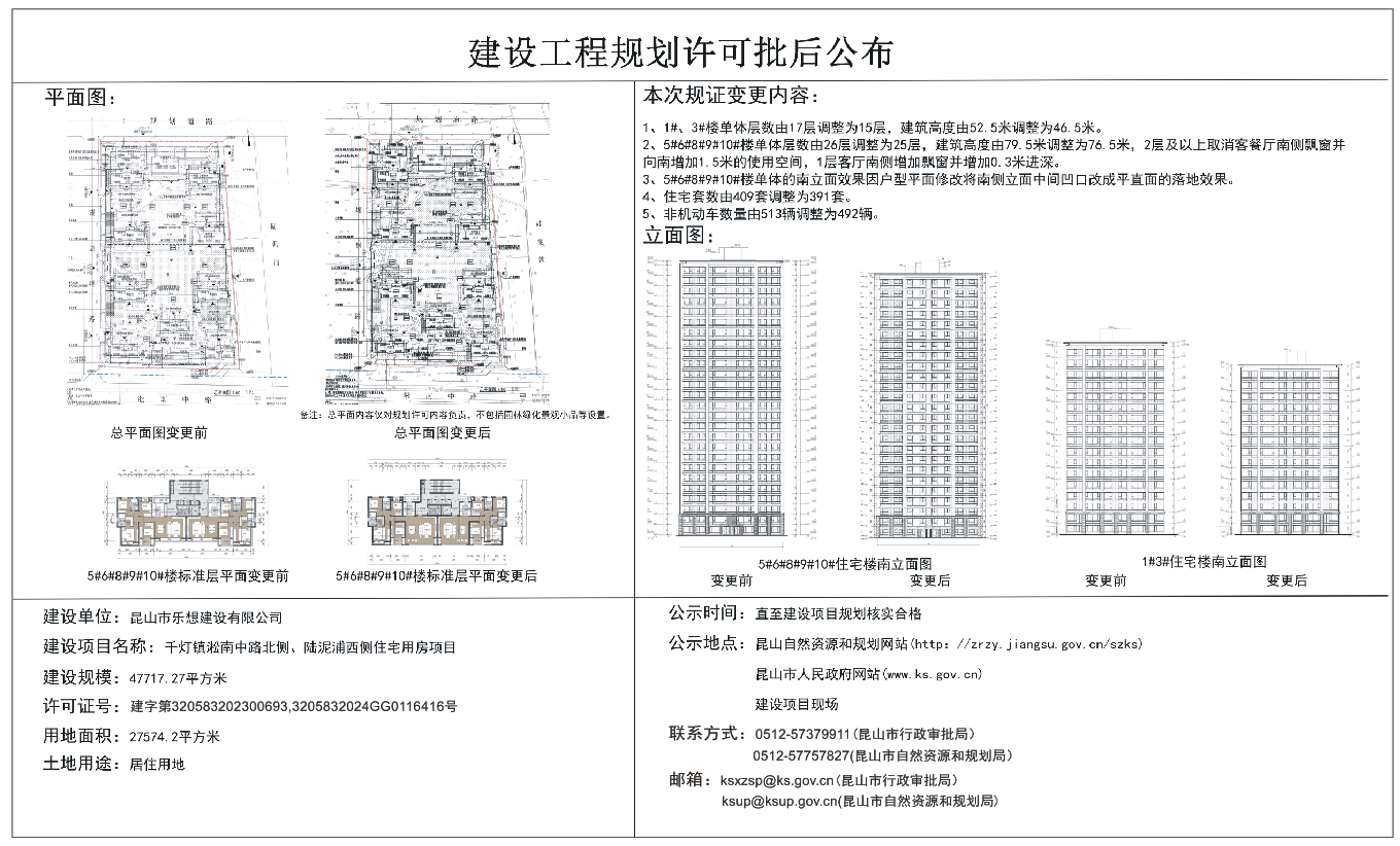 昆山市樂想建設(shè)有限公司建設(shè)千燈鎮(zhèn)淞南中路北側(cè)、陸泥浦西側(cè)住宅用房項目(變更)批后公布